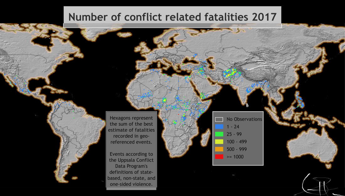 Since I most familiar with the Uppsala Conflict Data Program’s (UCDP) data on conflict related fatalities, I thought it’d be a good idea to upload my first map using their geo-referenced event data set UCDP Georeferenced Event Dataset (GED) Global version 18.1 (2017).